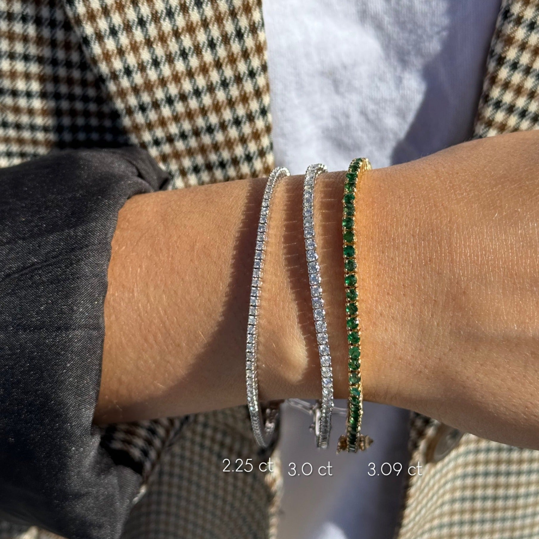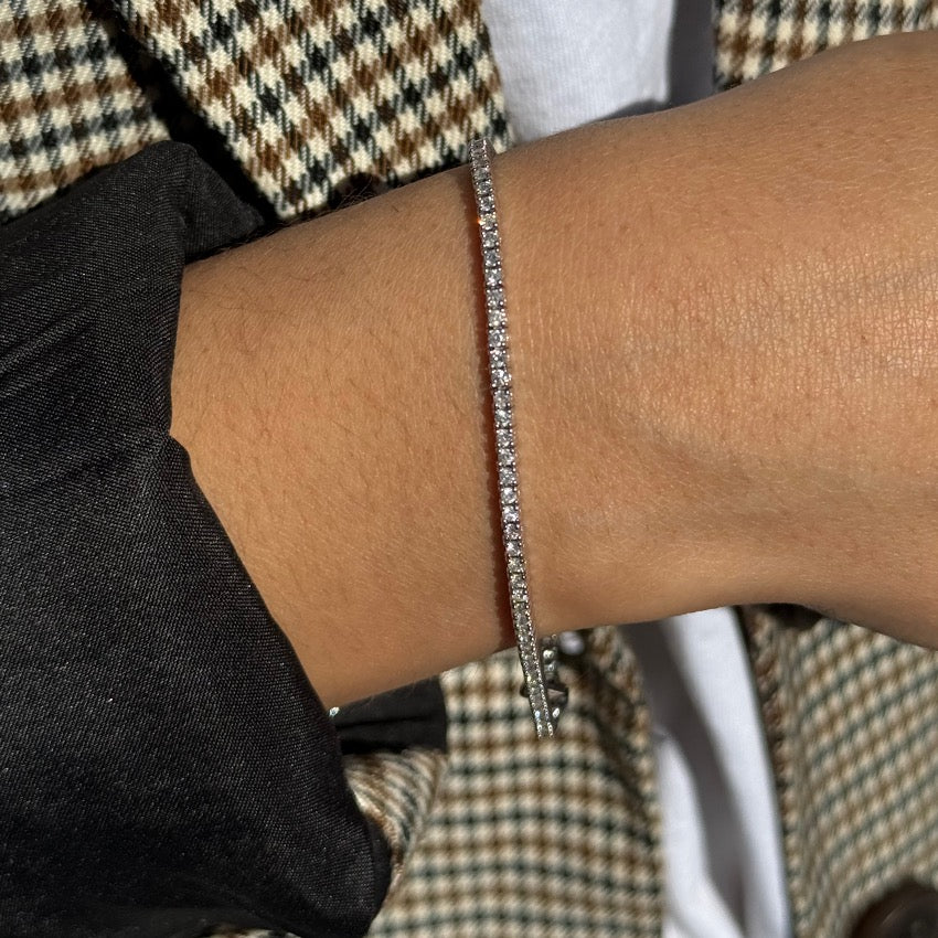 An elegant piece of jewelry that features a symmetrical a row of natural Diamonds joined together by a delicate gold chain and set among four slim prongs. The diamonds used in the tennis bracelet are typically the same color, cut, clarity, and carat. Whether it’s dressed up or dressed down, it is designed to brings, stand out and catch the eye whether it is worn stacked or solo.