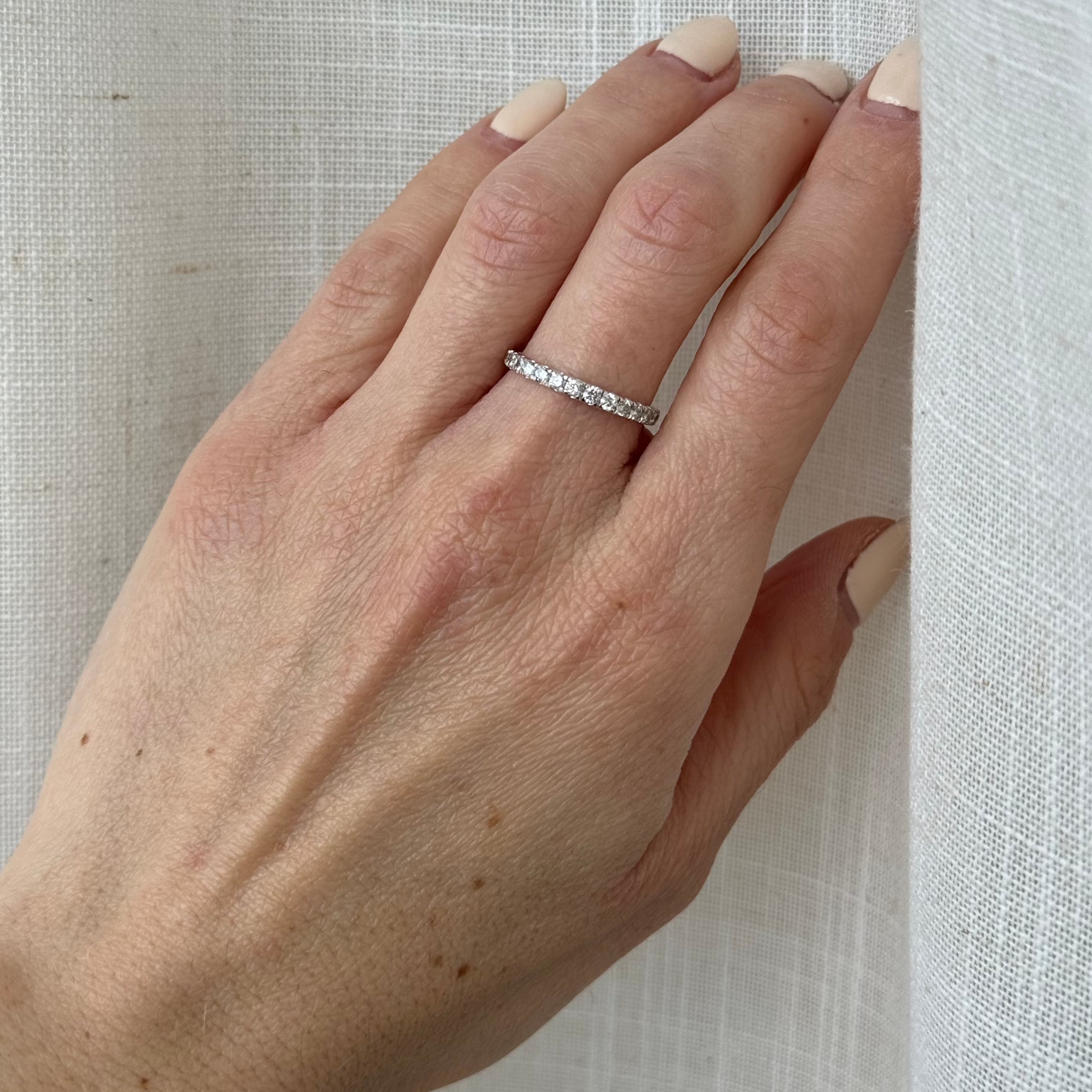 Half circle of one row with 17 round cut brilliant diamonds in a Pavé setting. This band’s low-profile and elegant setting perfectly pairs with any engagement ring design.