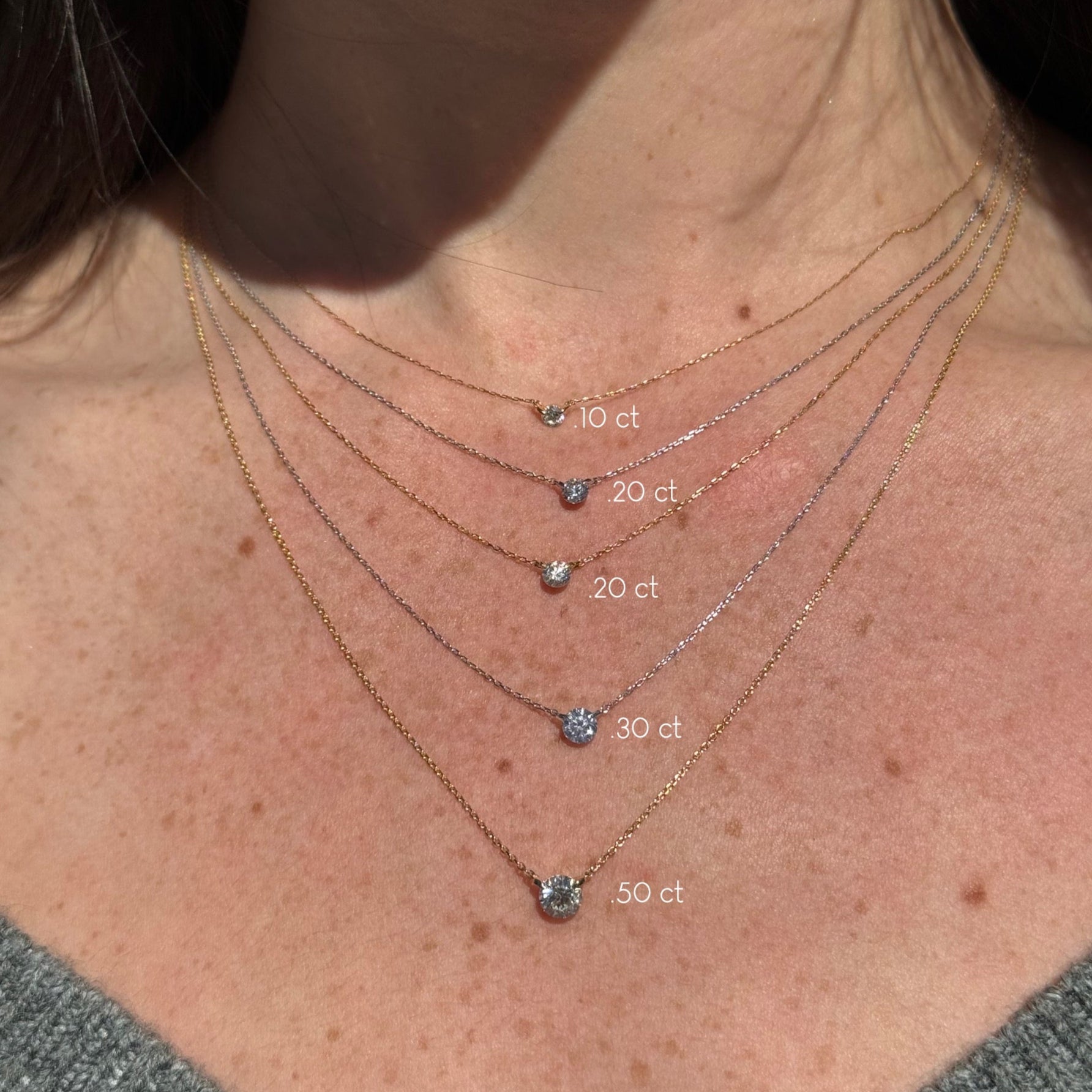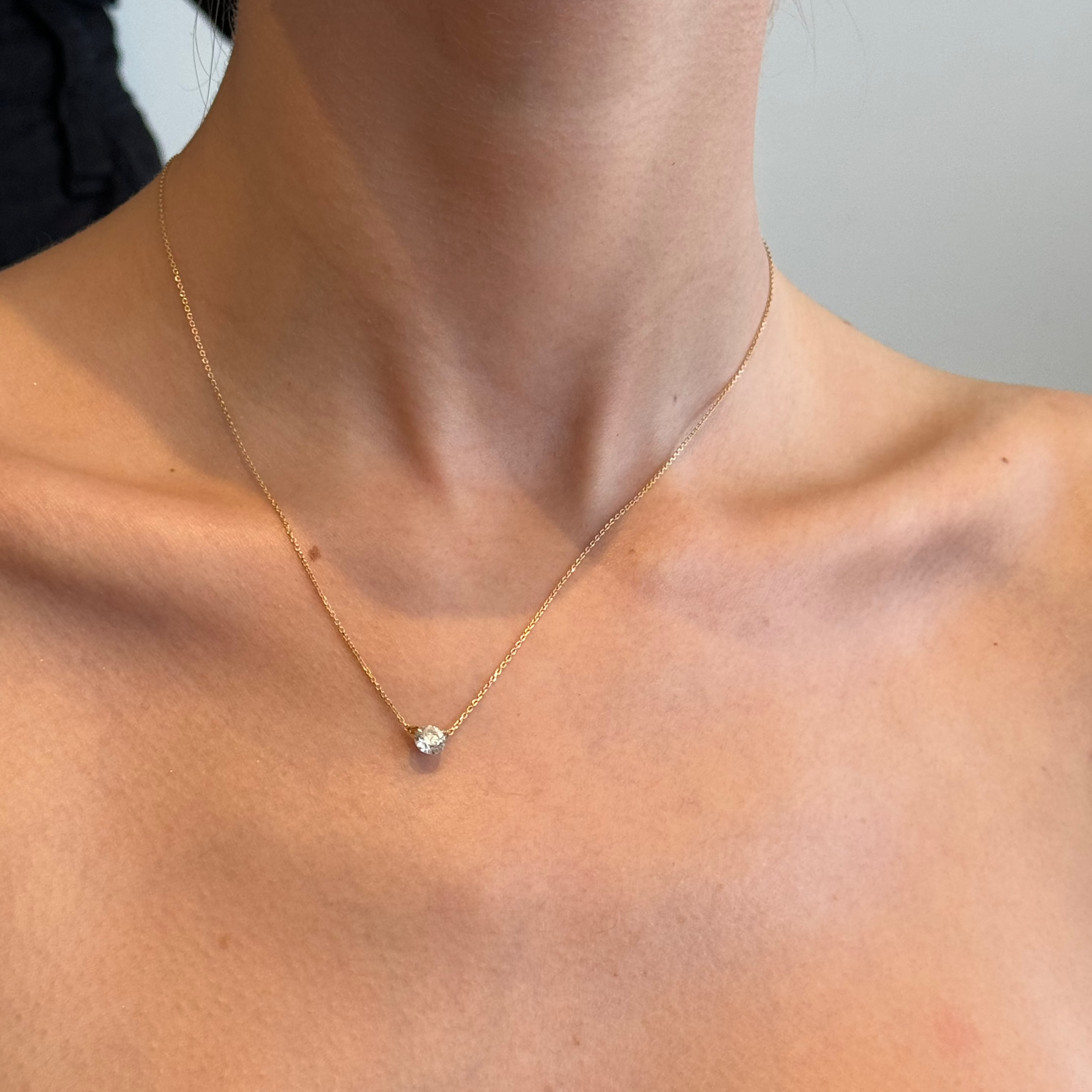 Complete your jewelry collection with this essential. A solitaire round brilliant cut diamond is hand-set on a gold cable chain, adding understated elegance to your neckline. This necklace is designed to be layered with your favorite pieces or to be worn by itself.