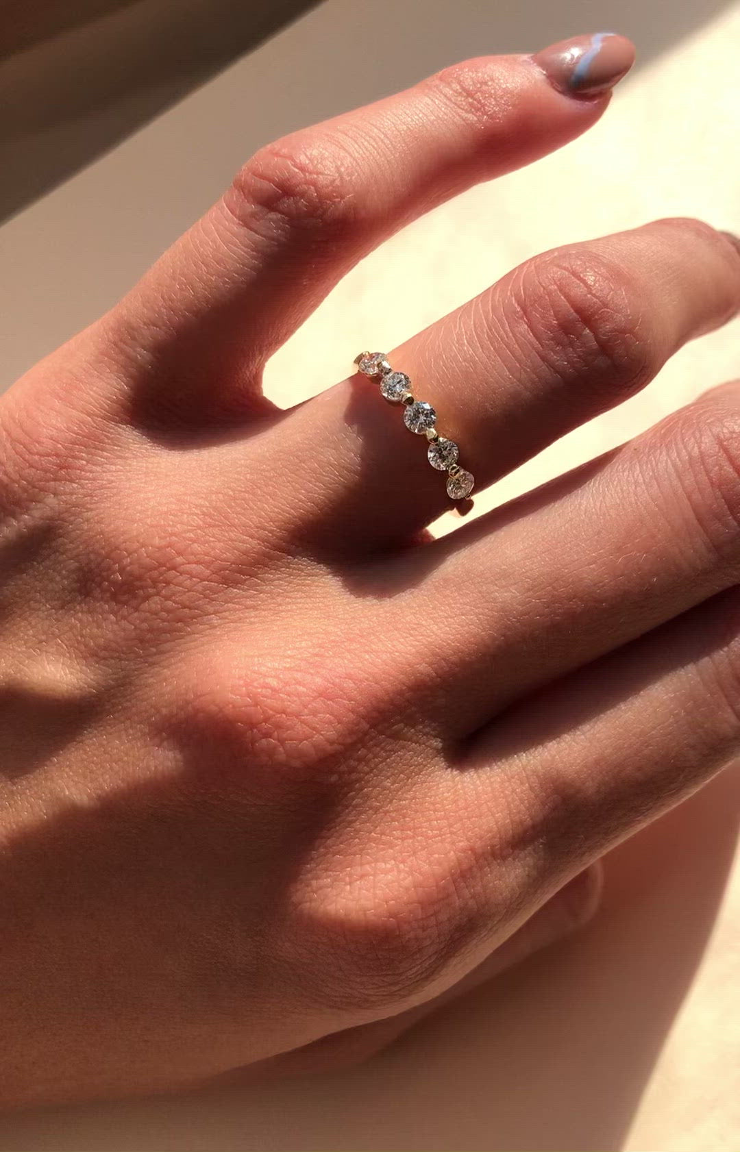 A half-circle of round cut brilliant diamonds shines in this gold band. The design makes a brilliant statement on its own or is equally radiant when worn in a stack, which gives a classic look but, thanks to the setting it gives the illusion as if they are floating.
