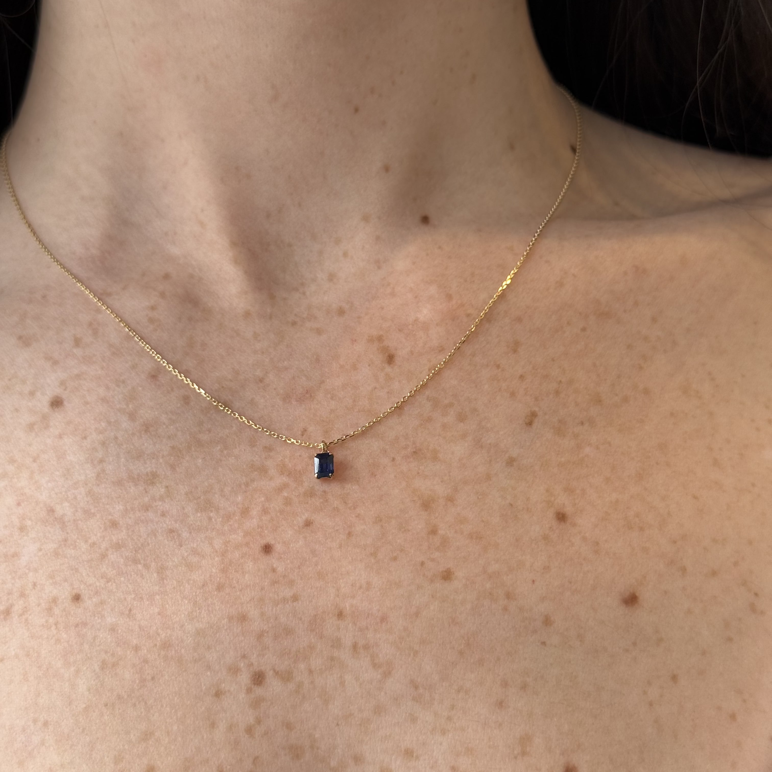 Complete your jewelry collection with this essential piece. A Emerald cut Blue Sapphire hand-set on a cable chain, adding understated elegance and color to your neckline. This necklace is designed to be layered with your favorite pieces.